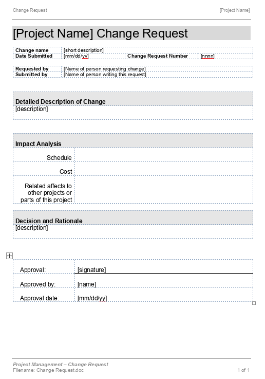 Le richieste di modifica fungono da documenti formali e sono una componente fondamentale di un piano di gestione delle modifiche. Questi documenti delineano le modifiche a qualche aspetto del progetto o dell'organizzazione, di solito a un livello elevato, come una deliverable di progetto o le operazioni organizzative.