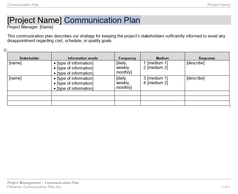 Un piano di comunicazione serve a definire le informazioni da diffondere al team di progetto e agli stakeholder del progetto. Non solo definisce cosa deve essere comunicato, ma anche quando deve essere comunicato e con quale frequenza. Il piano di comunicazione deciderà anche il canale di trasmissione della comunicazione. Queste informazioni probabilmente variano a seconda dei destinatari della comunicazione.