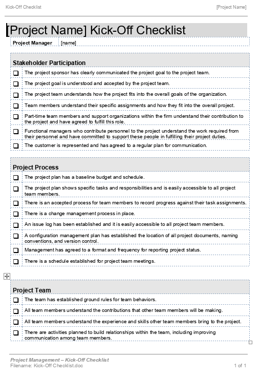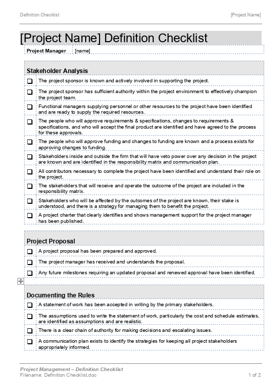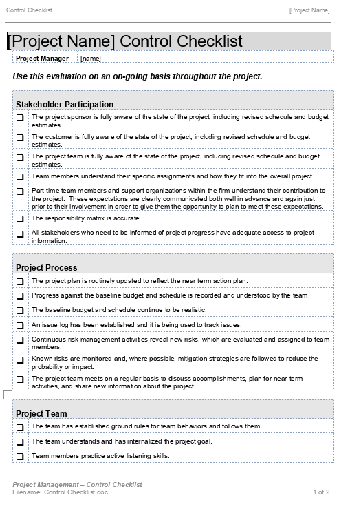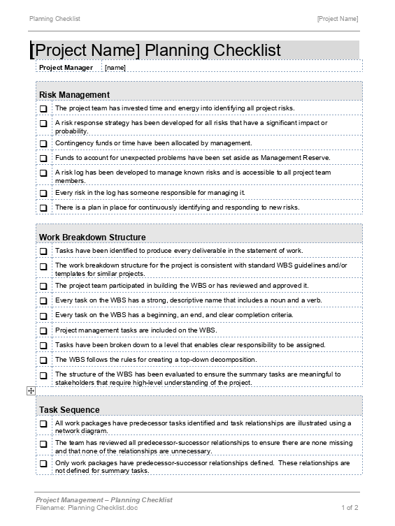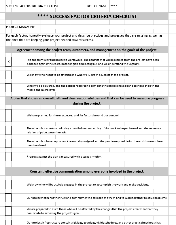 Questa lista di controllo identifica gli argomenti fondamentali e forniscono al PM, al team e alla direzione un modo rapido per verificare l'esistenza di importanti fattori di successo in qualsiasi progetto.