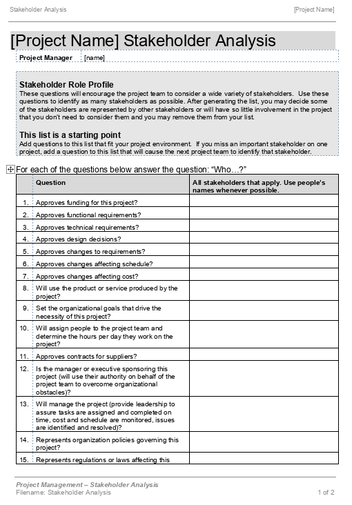 L'analisi degli stakeholder identifica e dà priorità alle parti interessate prima dell'inizio del progetto. Organizza gli stakeholder in gruppi in base alla loro partecipazione al progetto, al loro livello di interesse e alla loro influenza. Una volta identificate e organizzate queste persone, bisogna capire il modo migliore per coinvolgere ogni stakeholder nel progetto, compresi i migliori canali di comunicazione in base alle loro esigenze